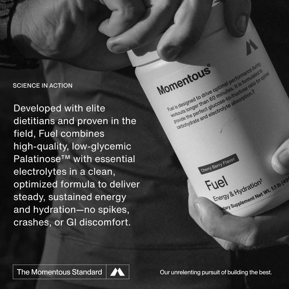 Momentous Fuel is a high-quality, science-backed energy and hydration drink mix for workouts lasting over 60 minutes. Offering an opptimized Glucose:Fructose Ratio, Fuel delivers slow-burning energy with no spike or crash that helps combat cramping and aids in muscle recovery. Fuel long sessions with the precise 3:1 carb ratio and essential electrolytes for sustaining peak performance when it matters most.