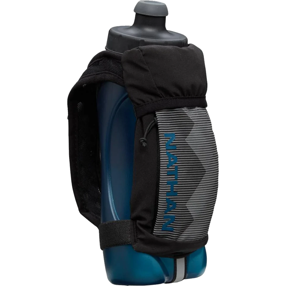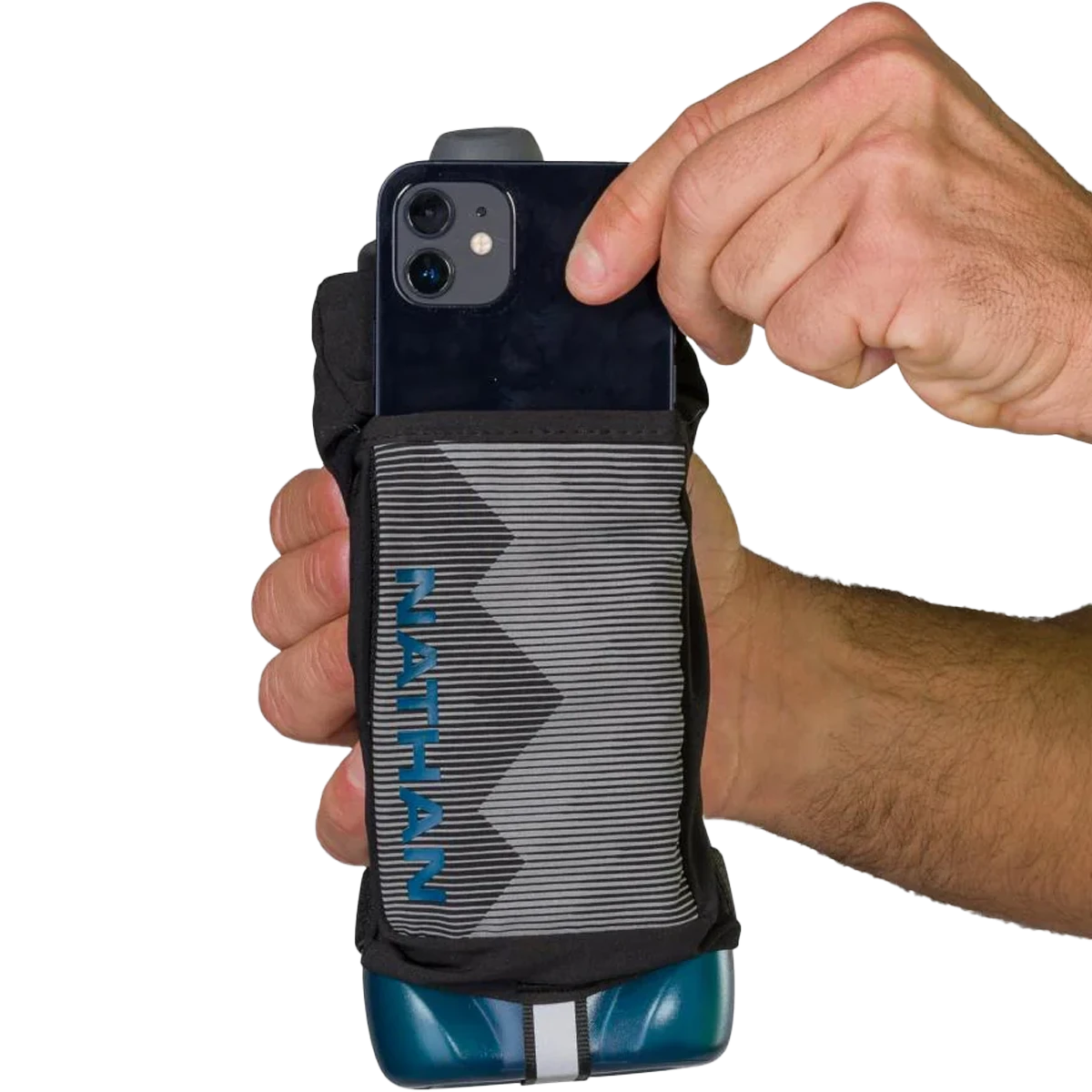 The QuickSqueeze Plus handheld bottles are 22oz and allow the wearer to hydrate with ease, and comfort and offer storage for phone and valuables. A flask with a contoured bottle and push-pull blast valve nozzle allows you to hydrate faster. The updated design includes a more secure hand strap system, that utilizes Nathan’s grip-free technology, and a softer bottle making it easier to squeeze and control the flow of water.