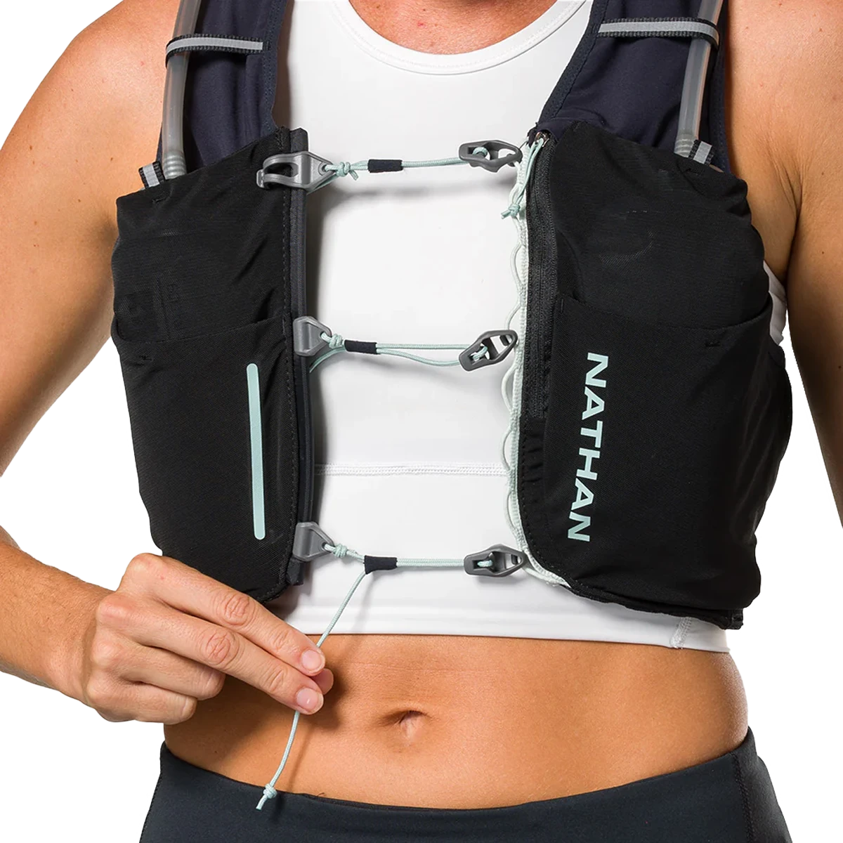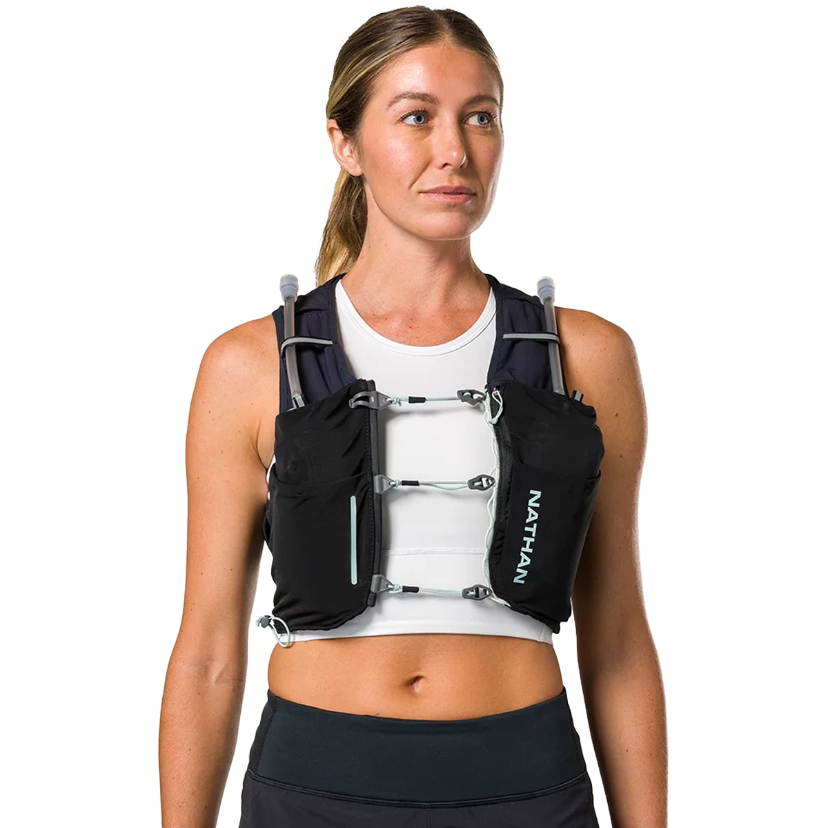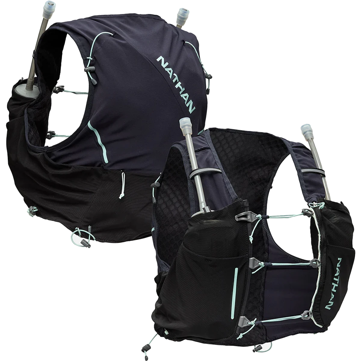 - Equipped with 2 Nathan x Hydrapak 20 oz/592 ml flasks with extended straws that can be cut / customized to wearers ideal length