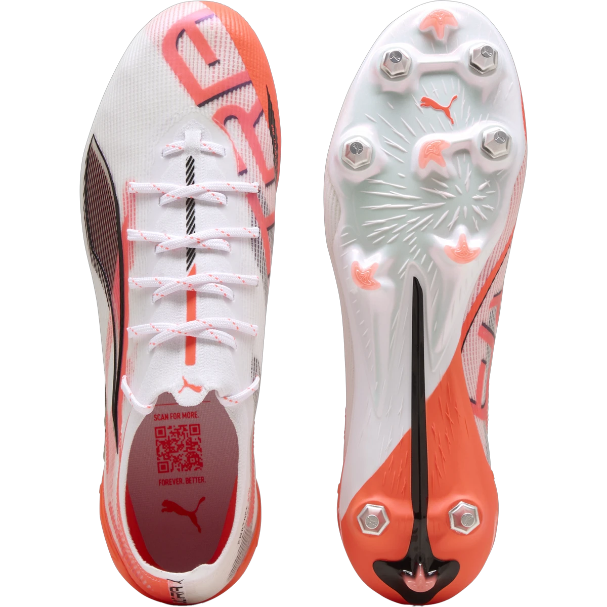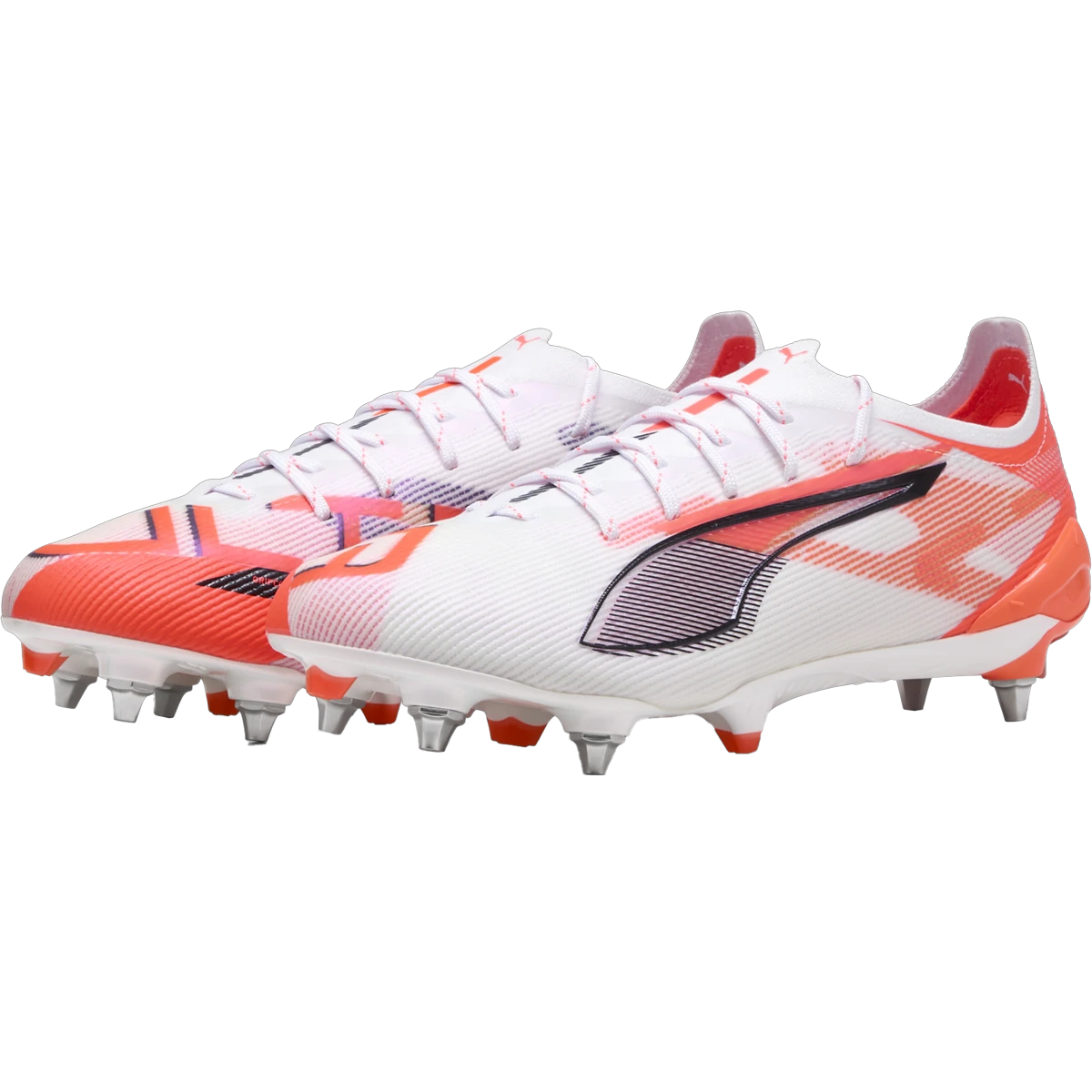 Built for breakaway speed and control, the PUMA Ultra 5 Ultimate MXSG cleats features PUMA’s new SPEEDSYSTEM outsole and grounded in insights from 23 years of motorsport design. Puma’s ULTRA ULTIMATE is designed with acceleration-focused SPEEDSYSTEM outsole that features a high-performance fiber base and external heel counter for explosive speed on soft ground. FastTrax and conical screw-in studs deliver elite-level traction on mixed soft ground, ensuring confident movement in any direction. The PWRTAPE SQD support frame stabilizes the foot without limiting agility, while the GripControl Pro skin enhances precision and control with every touch. A lightweight, removable sockliner with Nano Grip technology and Ortholite heel cushioning provides a locked-in feel and all-game comfort.