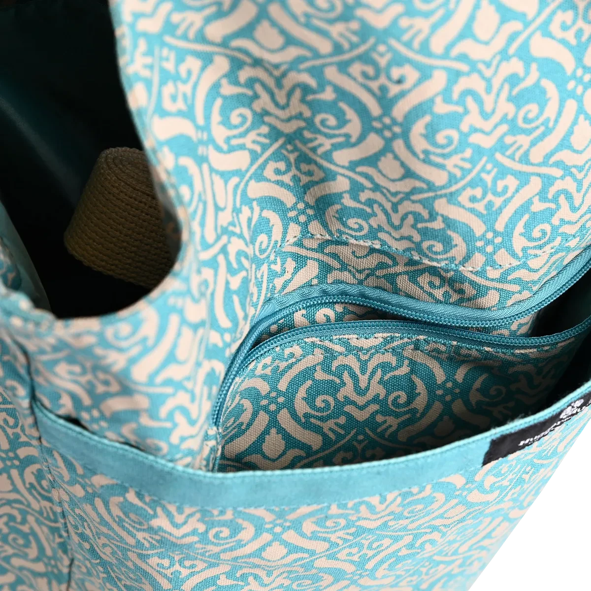 The Yoga Tote was made with convenience in mind. This versatile bag has a thoughtful construction to help you organize your yoga gear and personal belongings with style. It fits all Hugger Mugger mats, as well as most other yoga mats. For added practicality, the Yoga Tote includes attached inner straps that keep most mats neatly and securely rolled up. This gives you more space inside for a towel, strap, etc. The tote features an inner zippered pocket, perfect for stashing essentials such as your keys, phone, and other small items. An outer pocket provides quick and easy access to your water bottle and other necessities. In addition to its functionality, the Yoga Tote has a beautiful, subtle pattern with broad aesthetic appeal. This tote can double as a stylish daily shopping bag.